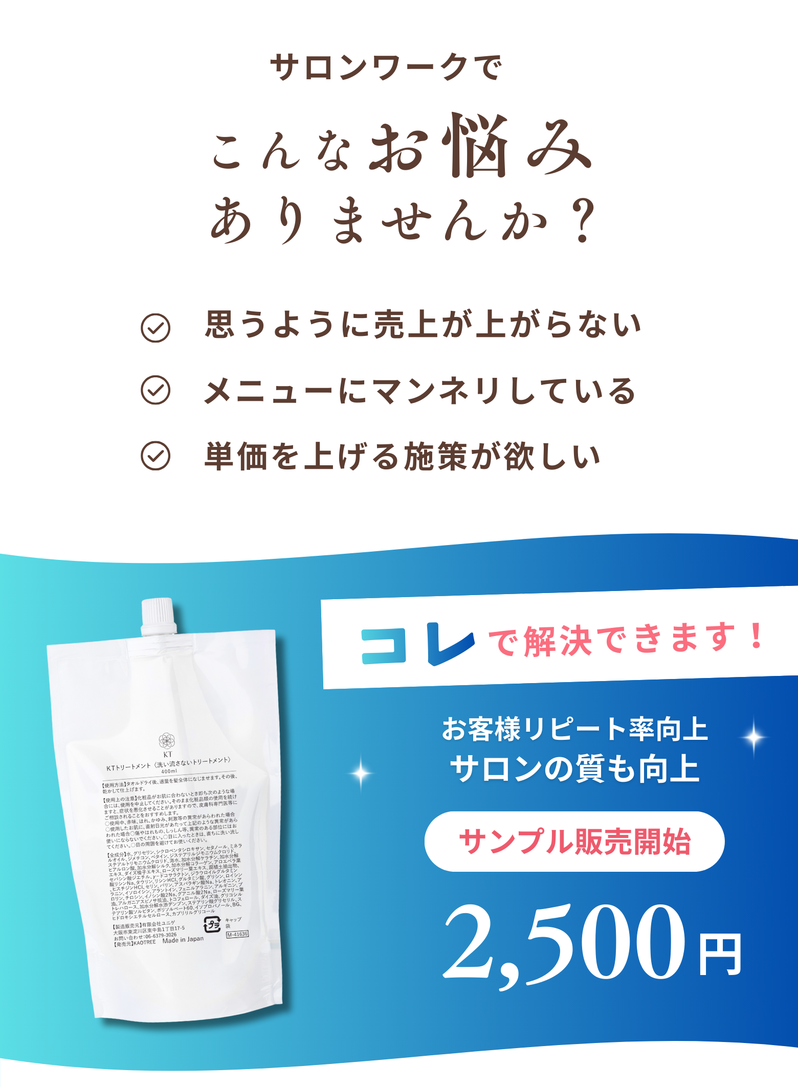 カット後・カラー後の“仕上げ”に使う、仕上がり特化型の業務用トリートメントです。