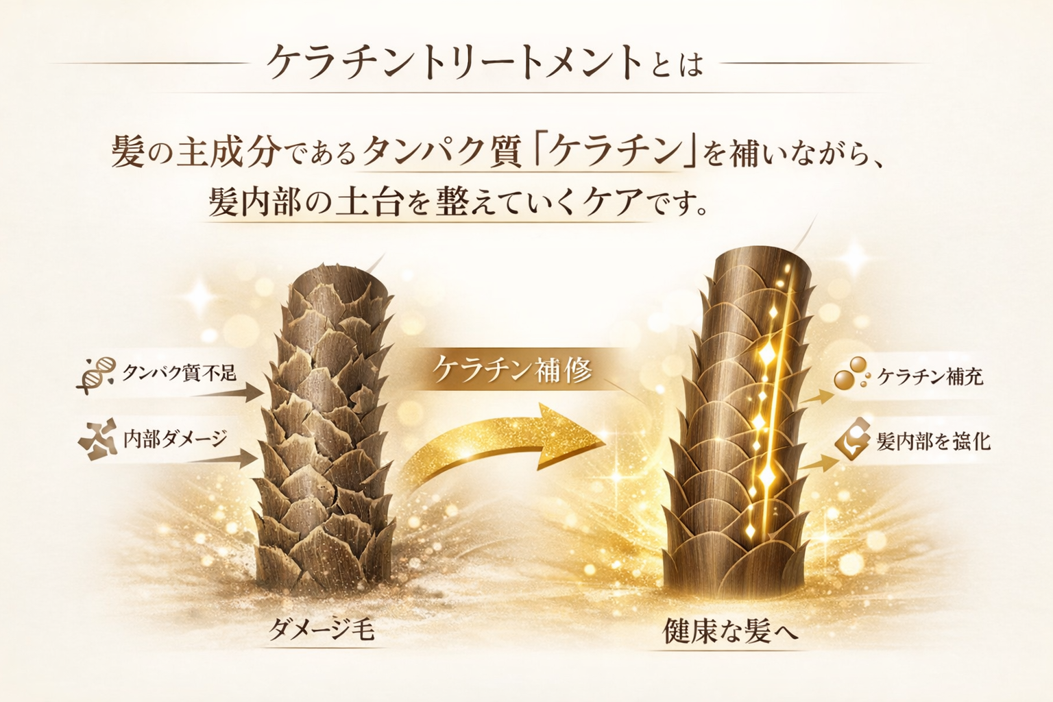 髪内部を補いながら艶とまとまりを底上げするのがケラチントリートメントと考えると分かりやすいです。